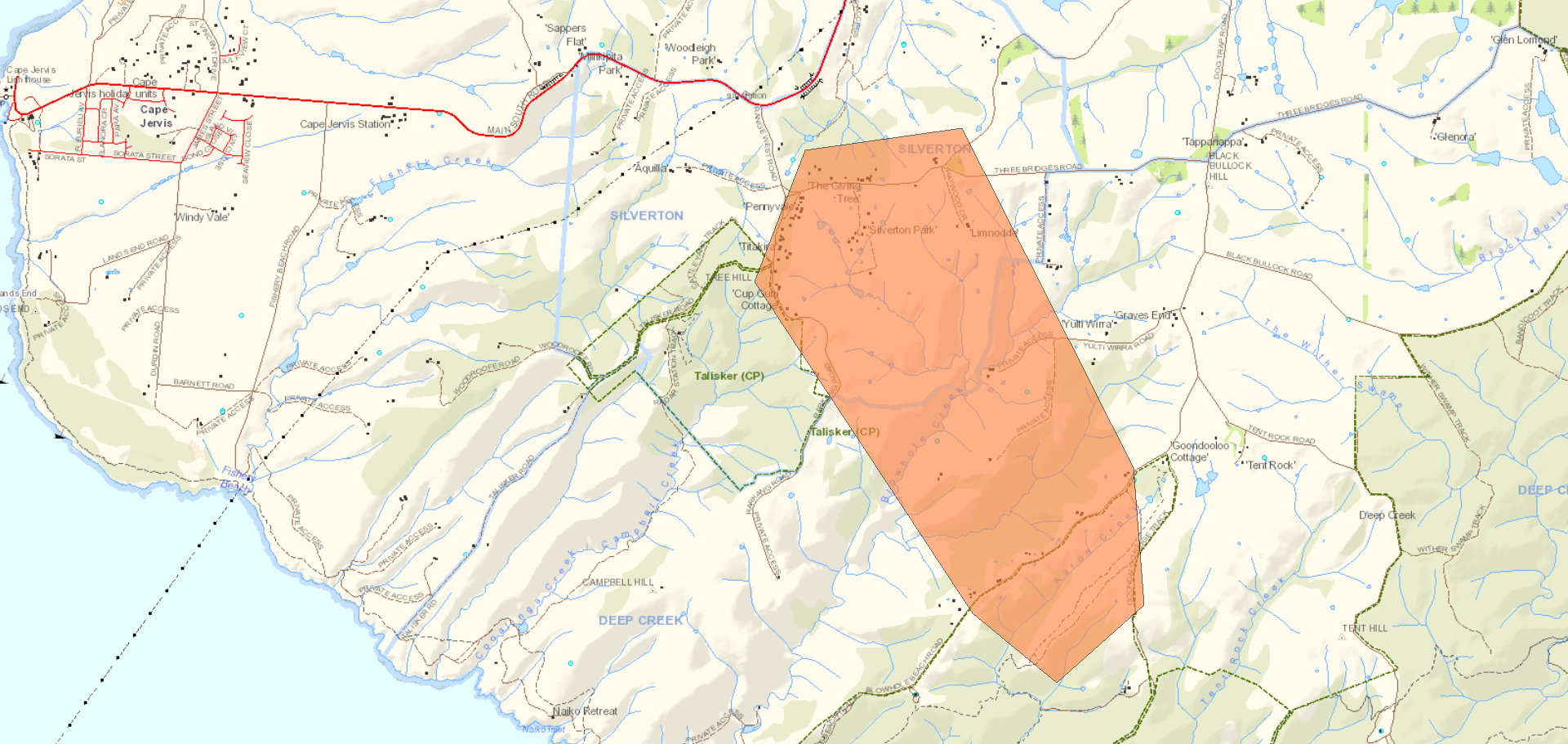 This warning was reissued to correct operational information This warning replaces previous warning - Advice issued on 01 Feb 2026 21:27 Issued on Warning area Warning level Action The Deep Creek bushfire is uncontrolled. This scrub fire is burning in a north westerly direction towards Blowhole Beach Road, Three Bridges Road, Rarkang Road, Silverton Court, Haywood Drive, Range West Road, Yulti Wirra Road, Talisker Conservation Park and the Silverton area North West of the Deep Creek National Park. Conditions are continually changing. For updates, check the CFS website at cfs.sa.gov.au or phone the Information Hotline on 1800 362 361. |