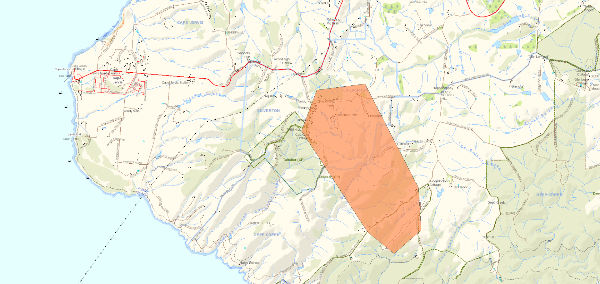 This warning was reissued to correct operational information This warning replaces previous warning - Watch and Act issued on 01 Feb 2026 22:33 Issued on Warning area Warning level Action The Deep Creek bushfire is uncontrolled. This scrub fire is burning in a north westerly direction towards Blowhole Beach Road, Three Bridges Road, Rarkang Road, Silverton Court, Haywood Drive, Range West Road, Yulti Wirra Road, Talisker Conservation Park and the Silverton area North West of the Deep Creek National Park. Conditions are continually changing. For updates, check the CFS website at cfs.sa.gov.au or phone the Information Hotline on 1800 362 361. |